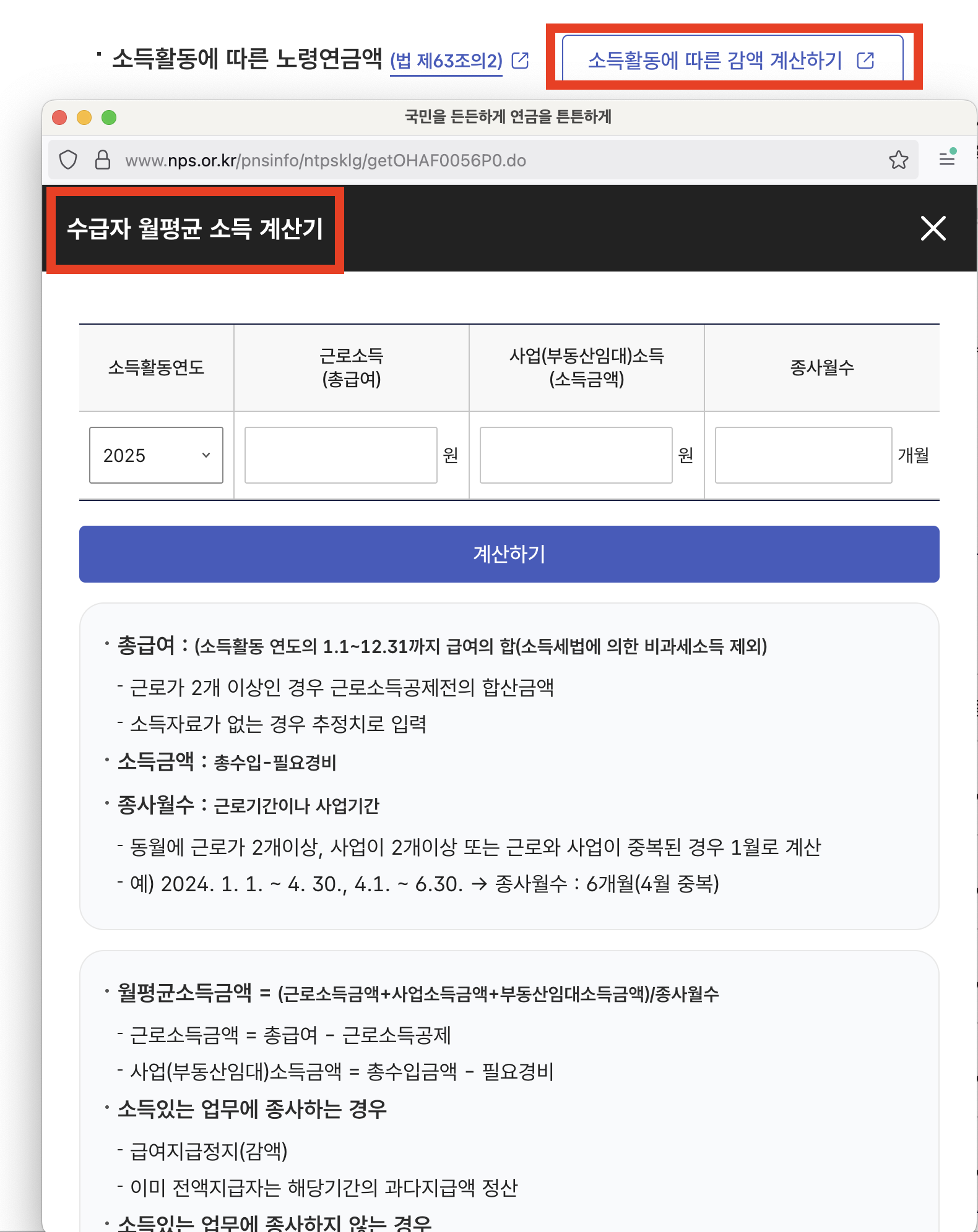 * 국민연금 홈페이지에서 소득활동에 따른 감액을 계산할 수 있습니다.